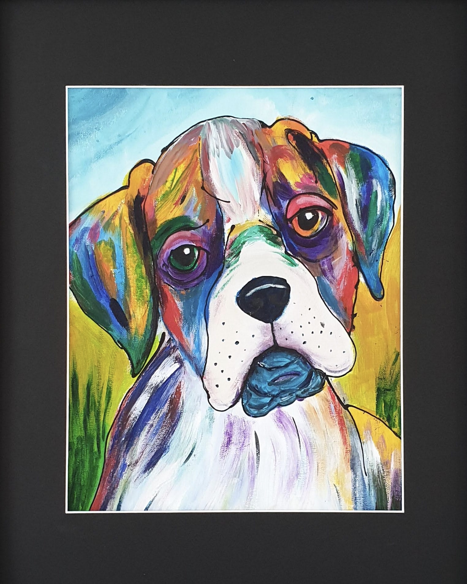 Dit hondje in een prachtig kleurenpalet is 30 x 40 cm, met de passepartout is hij 40 x 50 cm. Is dit een perfecte match in jouw woonkamer? Hij is €100,-