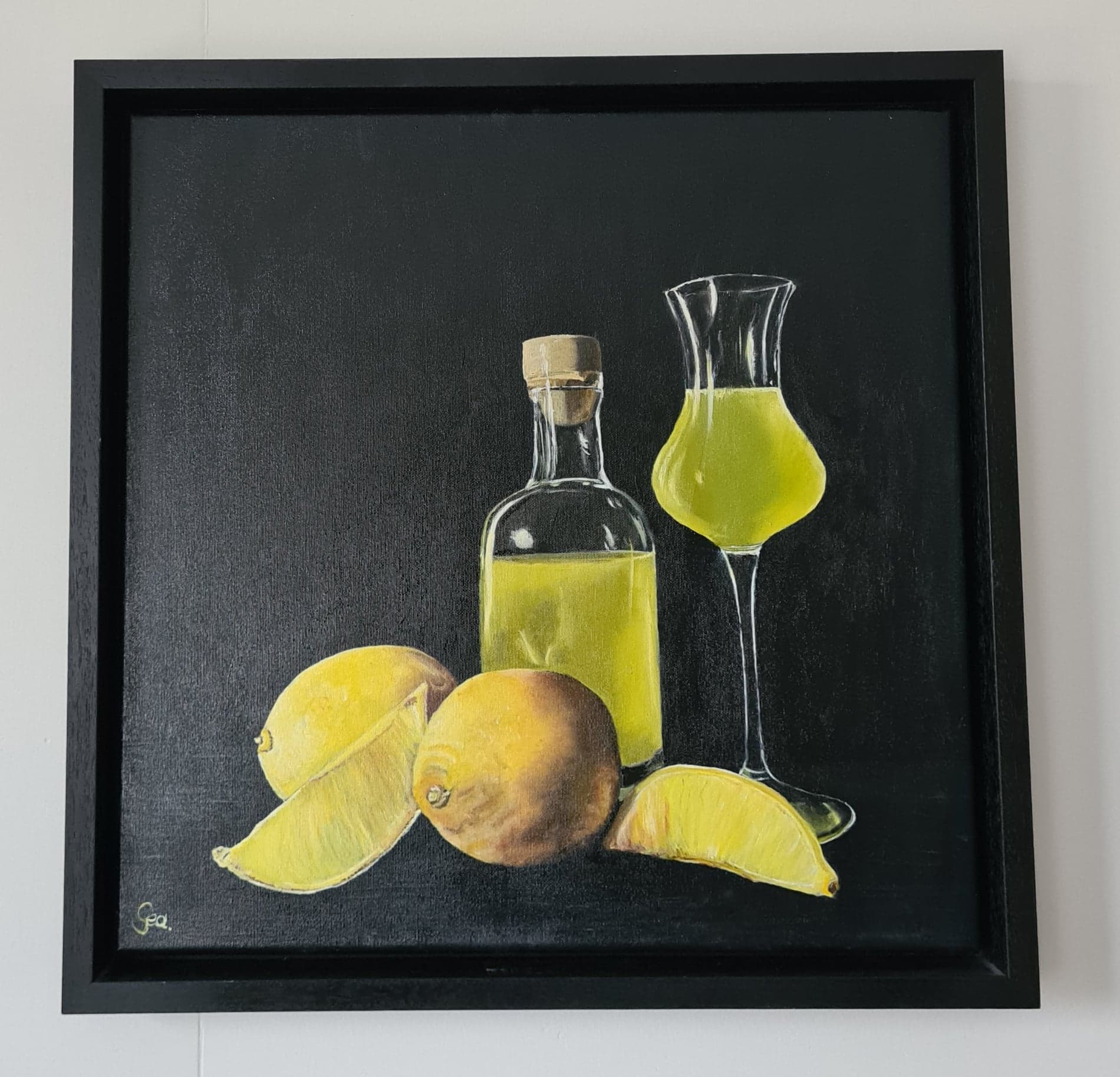 Uncategorized limoncello Prachtige gekleurde olieverf schilderij . Limoncello in baklijst. afmeting 50 x 50 €235,00